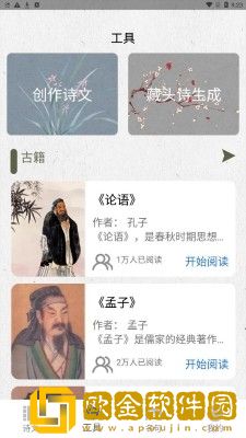 1、打开软件查看诗歌、工具、著名句子和我的个人中心,你可以选择使用它们;