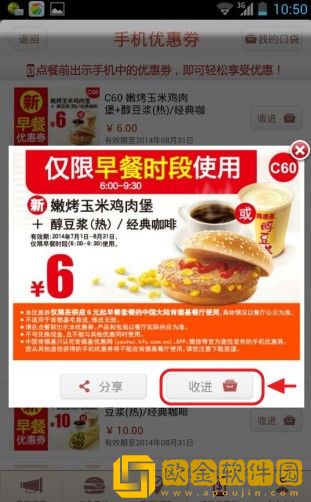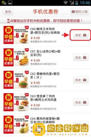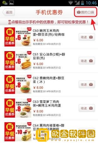 如图中所示是手机优惠券界面,在该界面上会以列表形式显示优惠券信息,看看是不是比在肯德基店里的价格便宜好多。只要你在购买时出示手机优惠券给销售人员,就可以以优惠券上的价格购买。为方便下次购买,你可以将优惠券放进"我的口袋"中,如图所示点击“收进”就可以将指定的优惠券收进口袋。
