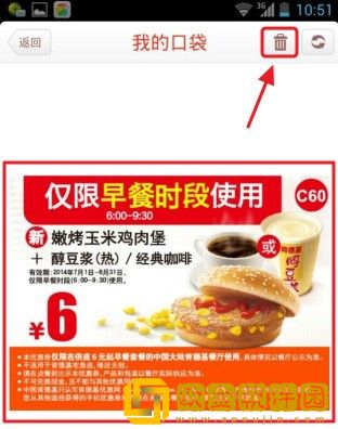 在"我的口袋"中会显示你已经收藏的优惠券信息,如果你不需要,也可以点击*箱图标进行删除。
