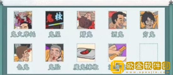 找到10只鬼:赌鬼、酒鬼、穷鬼、色鬼、鬼脸、魔鬼辣椒、鬼火摩托、鬼屋、油炸鬼、鬼