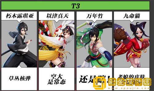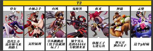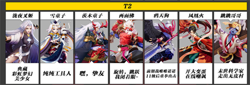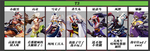 T1式神角色在游戏中是比较强势的,综合表现比较优秀,T2式神在游戏中表现不算突出,会根据玩家手法决定上线,T3式神强度一般。
