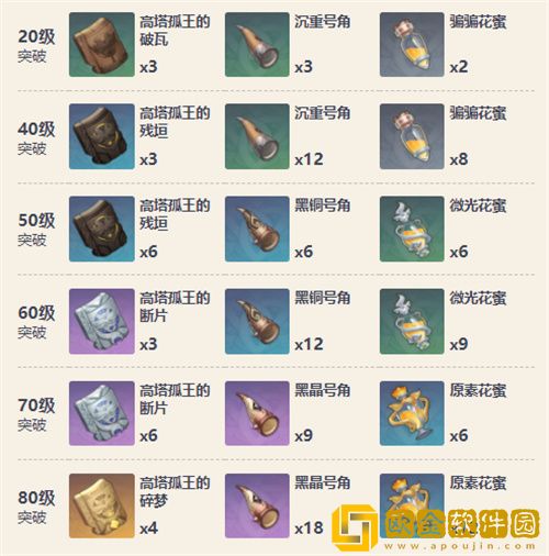 高塔孤王的破瓦可以在秘境:塞西莉亚苗圃(周一/周四/周日)获得,黑铜号角大家可以通过击败大体格丘丘人获得,原素花蜜大家需要通过击败骗骗花获得。