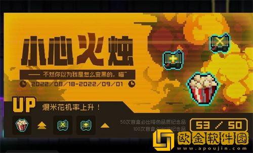 例如:爆米花卡池是50次内盲盒必出橙色品质纪录品,100次类盲盒必出up纪念品。
