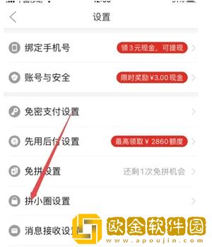 2、在设置中,点击“拼小圈设置”选项。