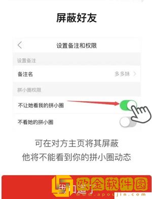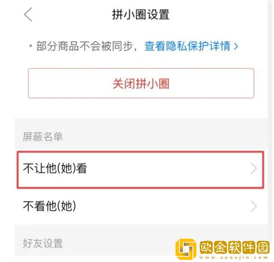 3、这里就会显示屏蔽名单,在不让他(她)看的名单里面的好友就不能看见拼小圈上同步的信息,也就看不到你买的东西了。设置的方式是打开好友的个人资料页面,然后开启“不让她看我的拼小圈”。