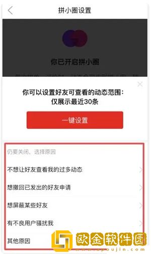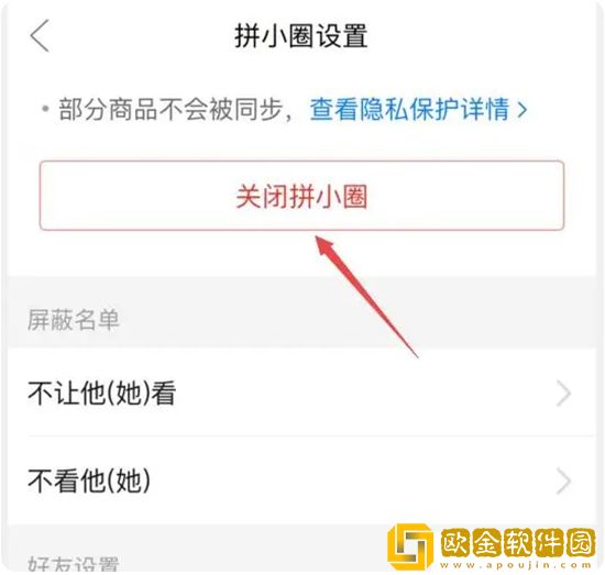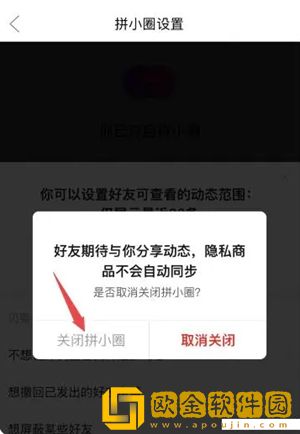4、更好的方式是直接关闭拼小圈,这样任何人都看不到你买的东西。直接在拼小圈设置中,点击“关闭拼小圈”。