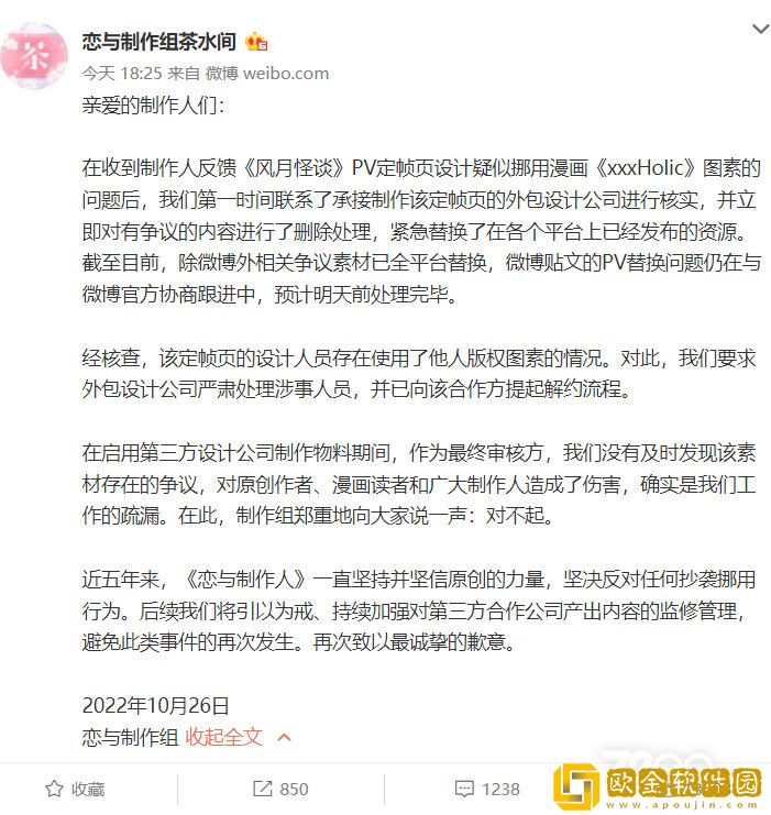恋与制作组茶水间 ** 号针对疑似挪用漫画《xxxHolic》图片素材问题发博道歉,并对有争议的内容进行了删除处理,替换了在各个平台上已经发布的资源。