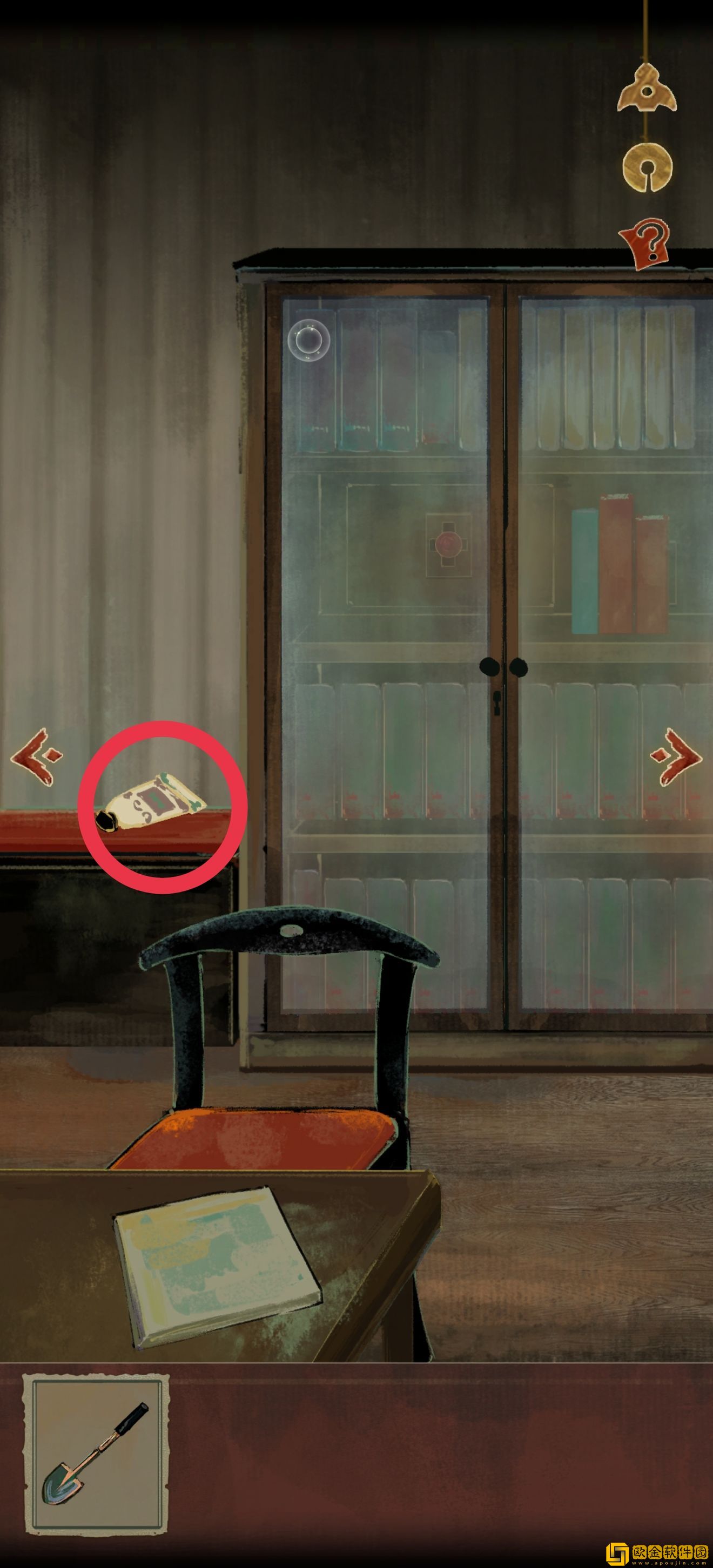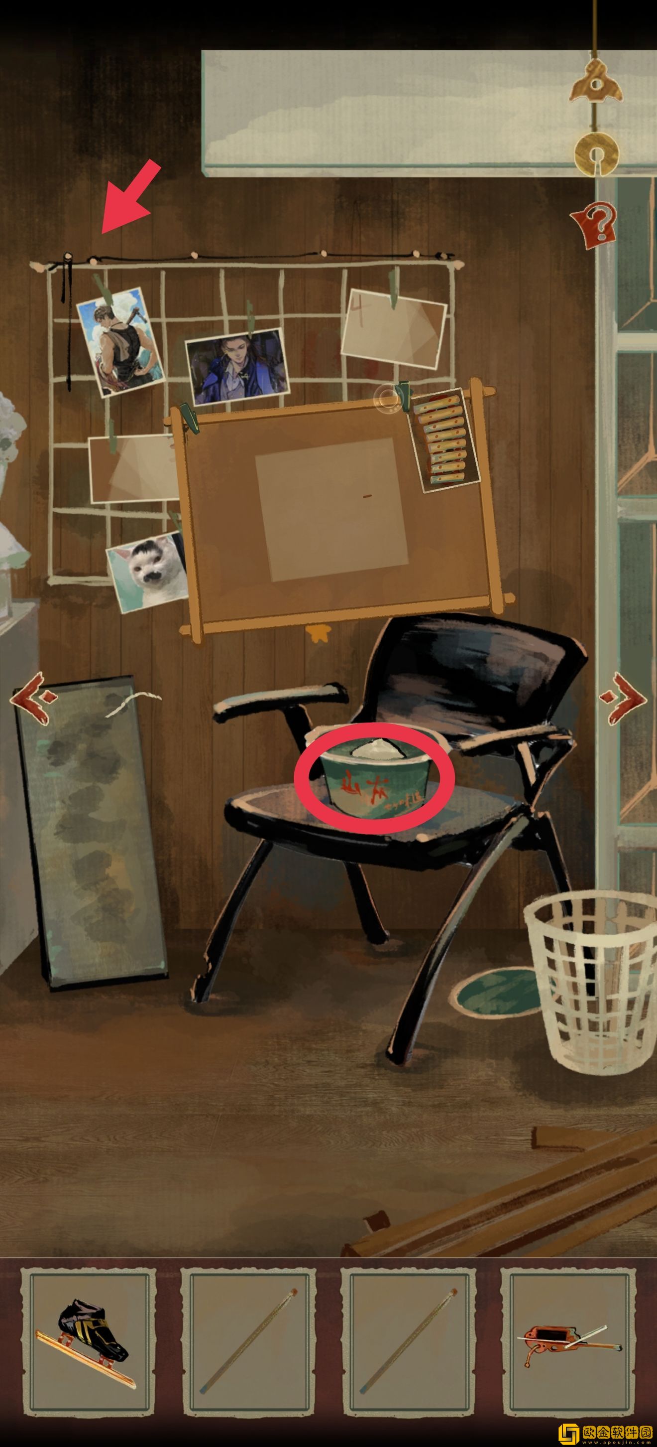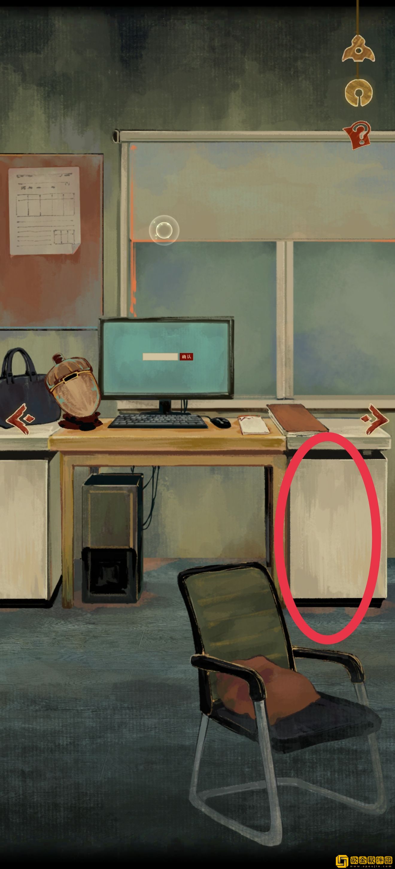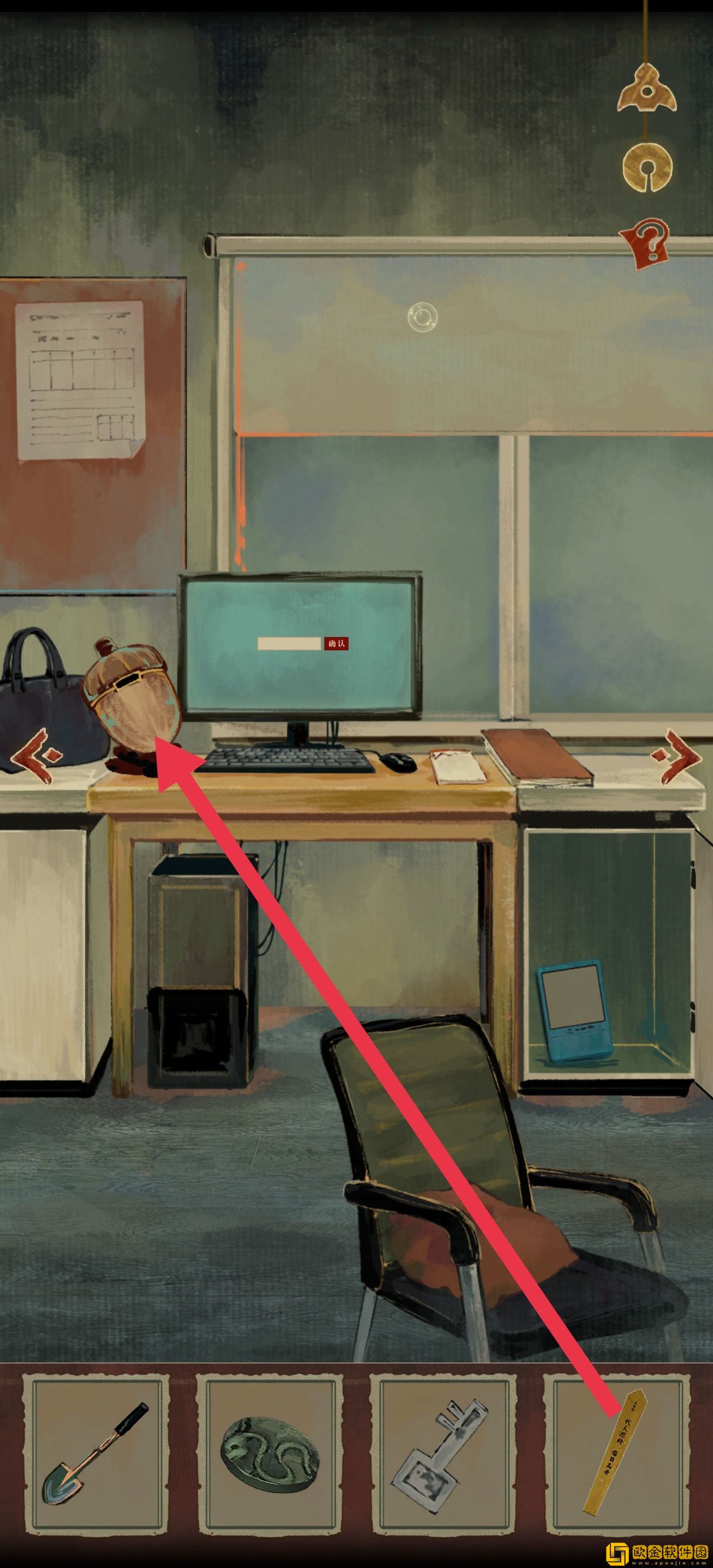 道具位置如图所示。注意右上角有个箭头,点进去以后可以收获xql(狗头)的一段打情骂俏,然后知道需要一个东西垫脚