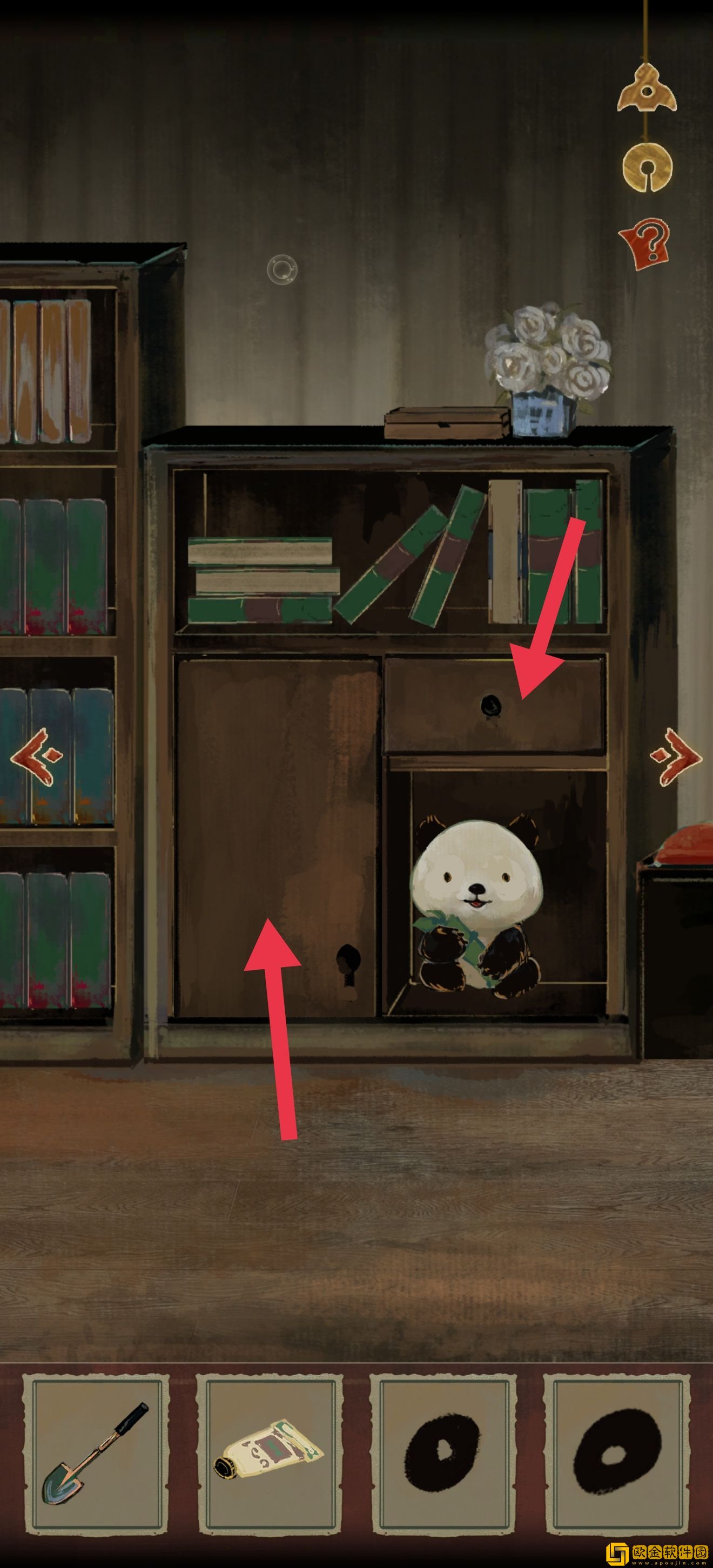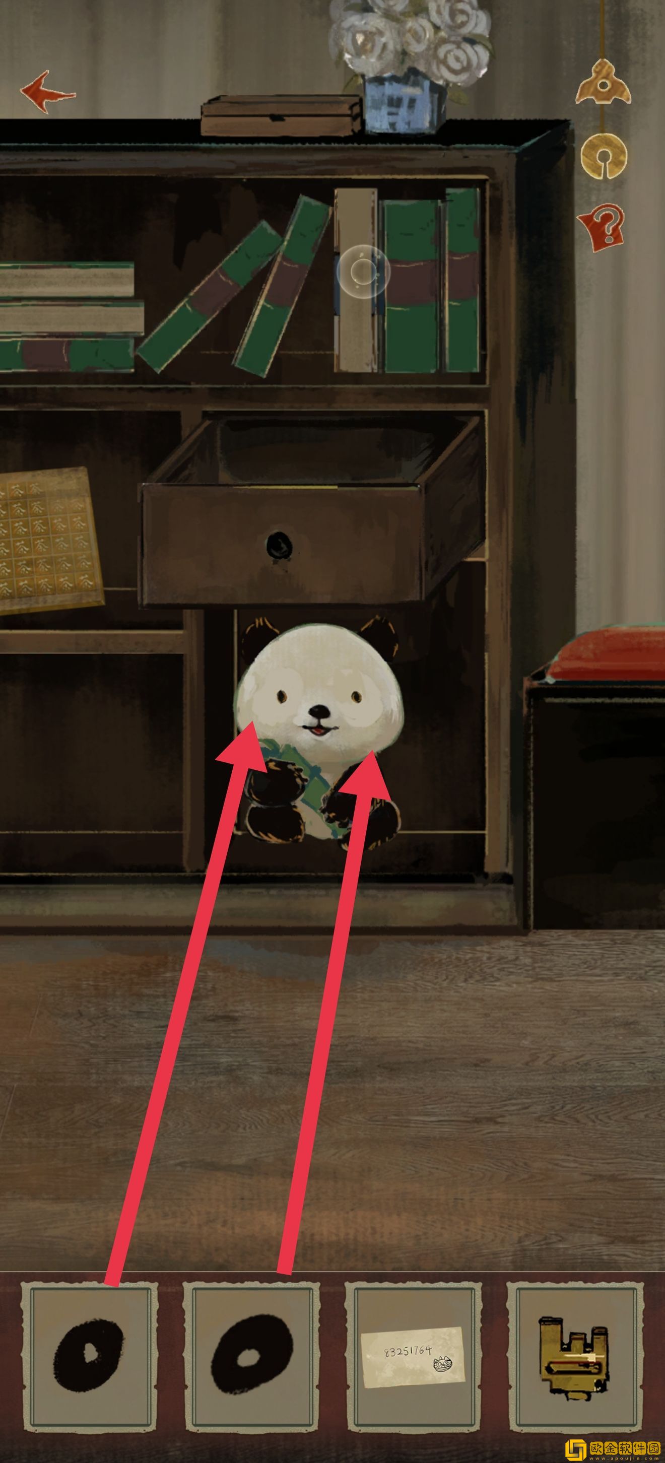 然后把黑眼圈安在小熊猫眼睛上,获得竹子,打开获得另一个钥匙组件