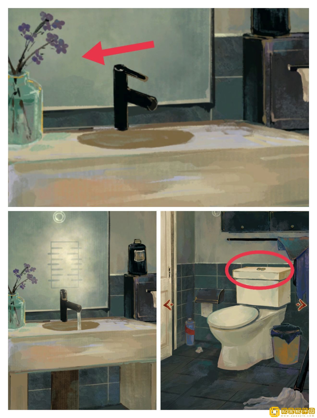 然后进入卫生间,向左滑动(划重点)打开水龙头的热水,水雾可以显出一个图案,用在马桶盖子打开以后拿出来的盒子上(忘记截图)
