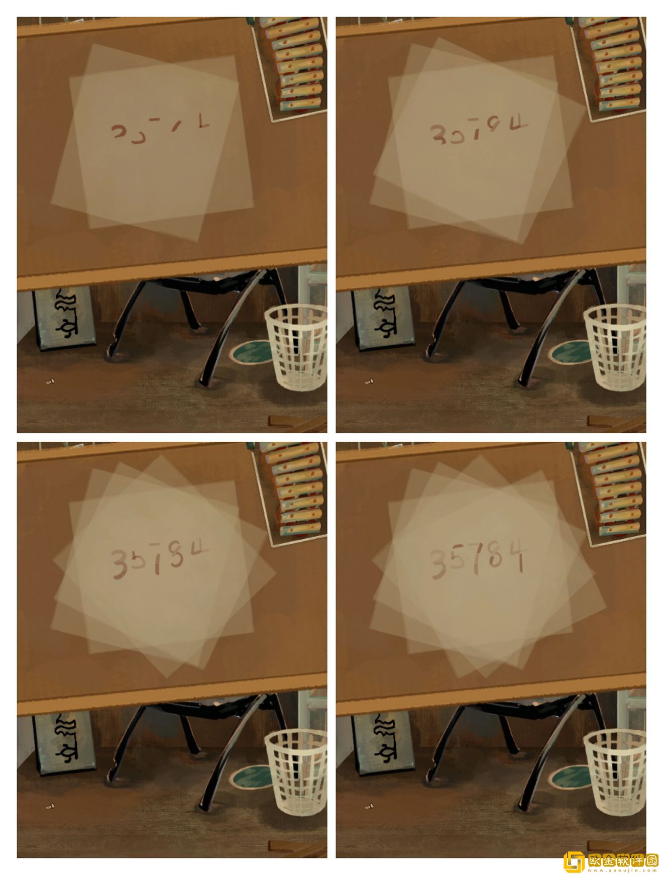 然后逐张将描红纸拖拽到白板上,旋转拼合后获得一串数字35784,根据旁边木琴照片我们可以知道是木琴的线索