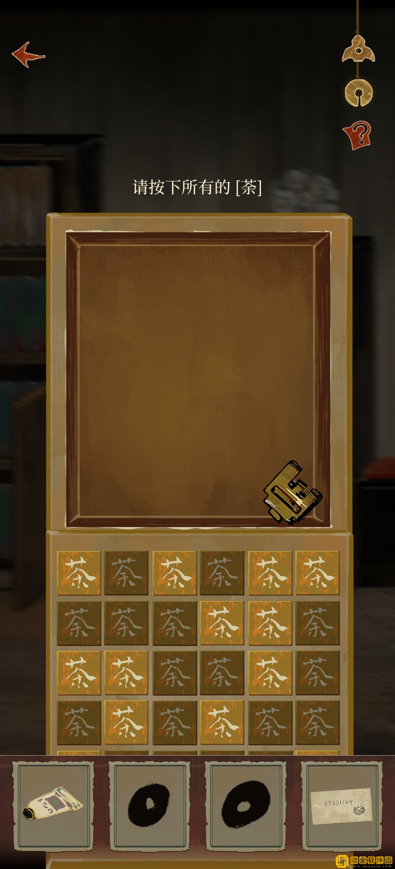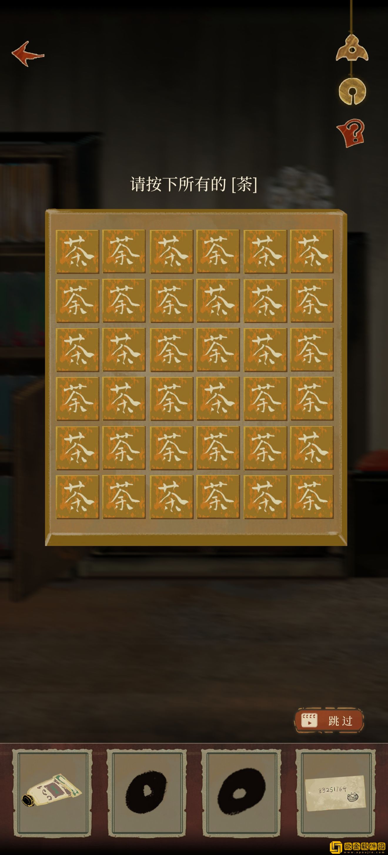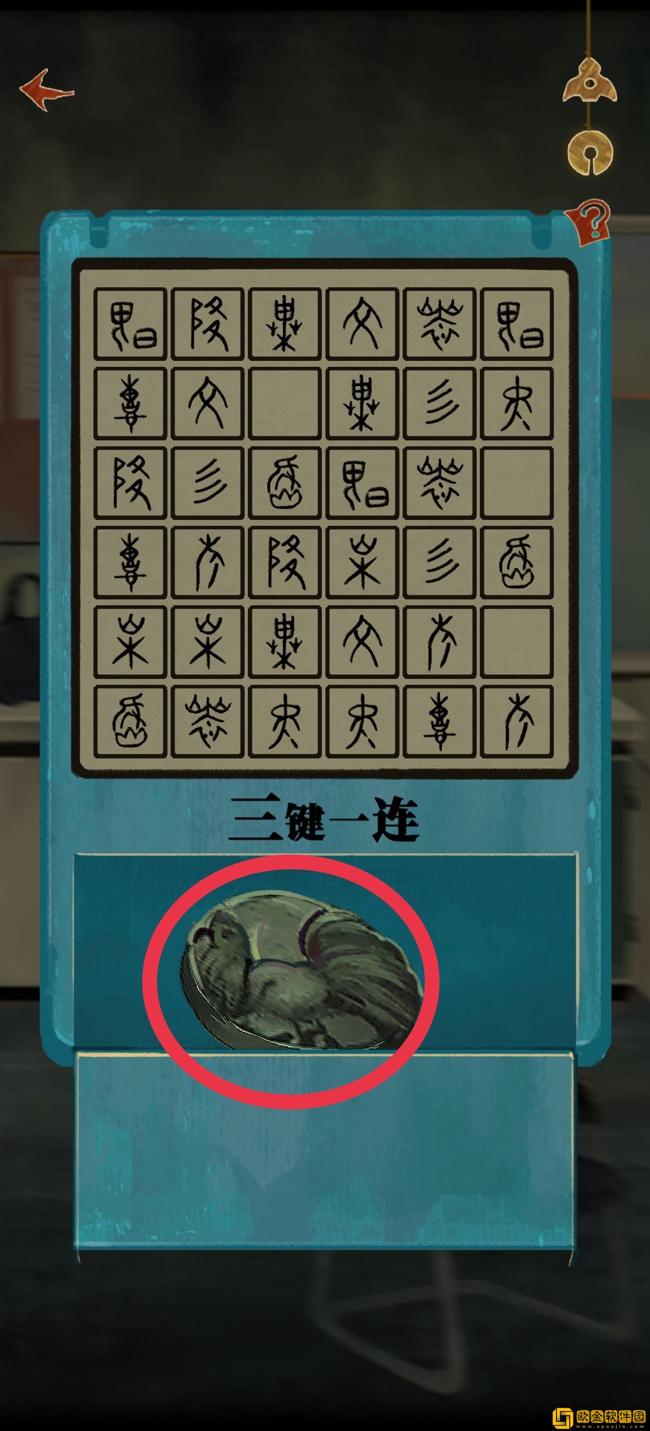 进门以后打开柜子有个小游戏(是谁看成了一键三连),就是将三个一样的块块点出来。进去以后拼手速截个图(题是随机的,所以我的截图不具有参考价值),第一次没有截到也没关系,重置以后可以再来一次,实在截不到可以一个一个点开找,再不行还可以跳过,完成以后获得鸡符咒。
