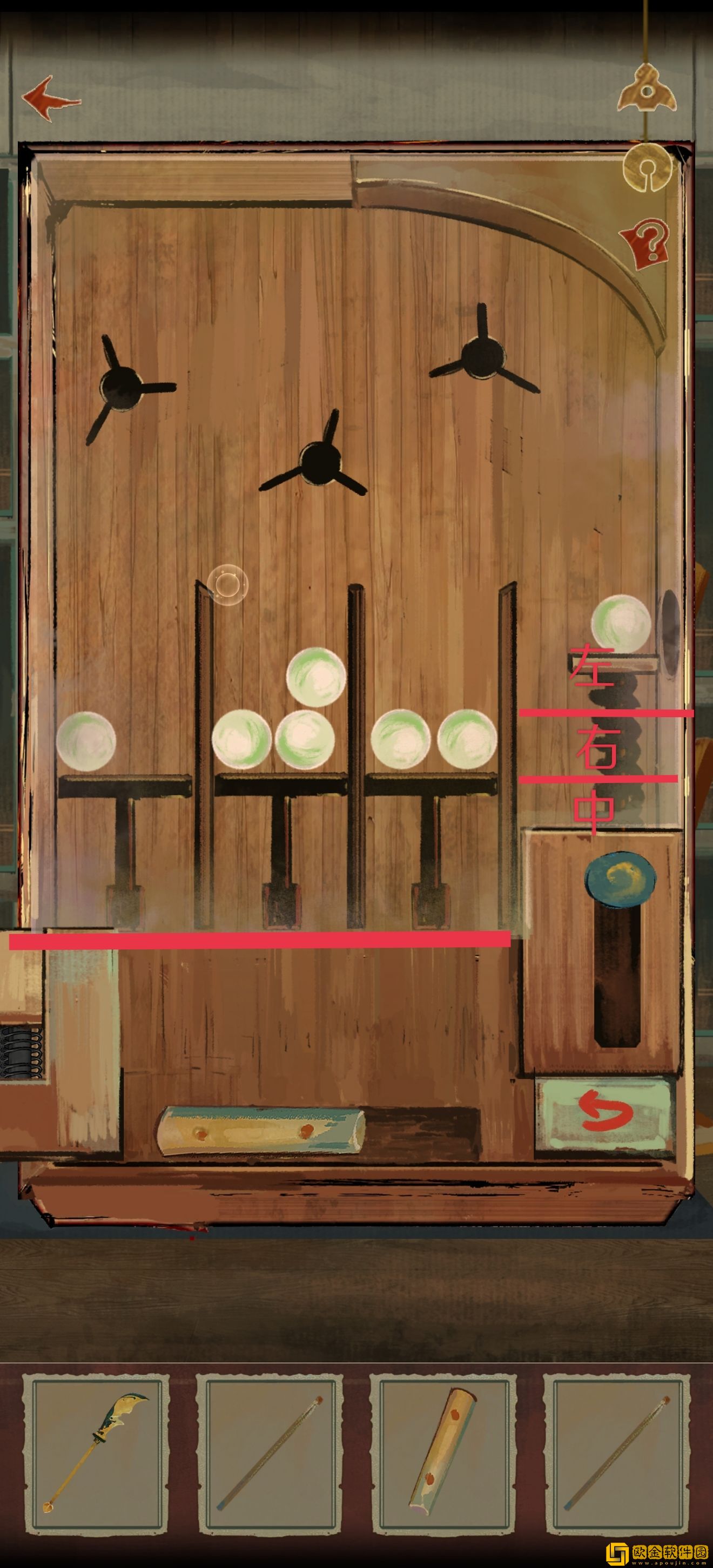 关于下面抽屉里的装置,是需要将小球弹入保证三个隔板在同一水平面(如左下红线所示),从左到右分别为1个,3个,2个小球。我大概试了一下,不同弹簧压缩的范围可以弹进不同格子(但是因为范围比较小而且可能会失误,所以运气不好就跳过吧)