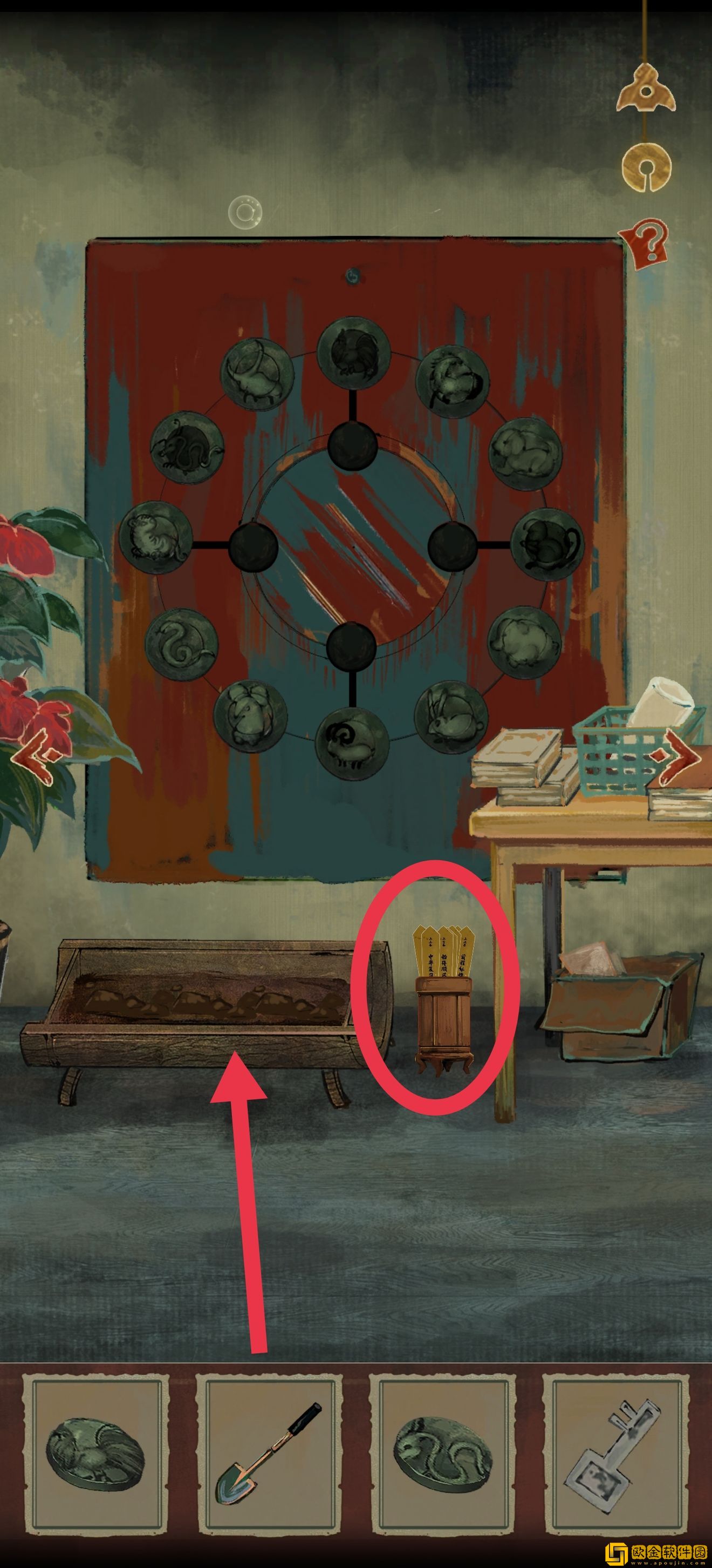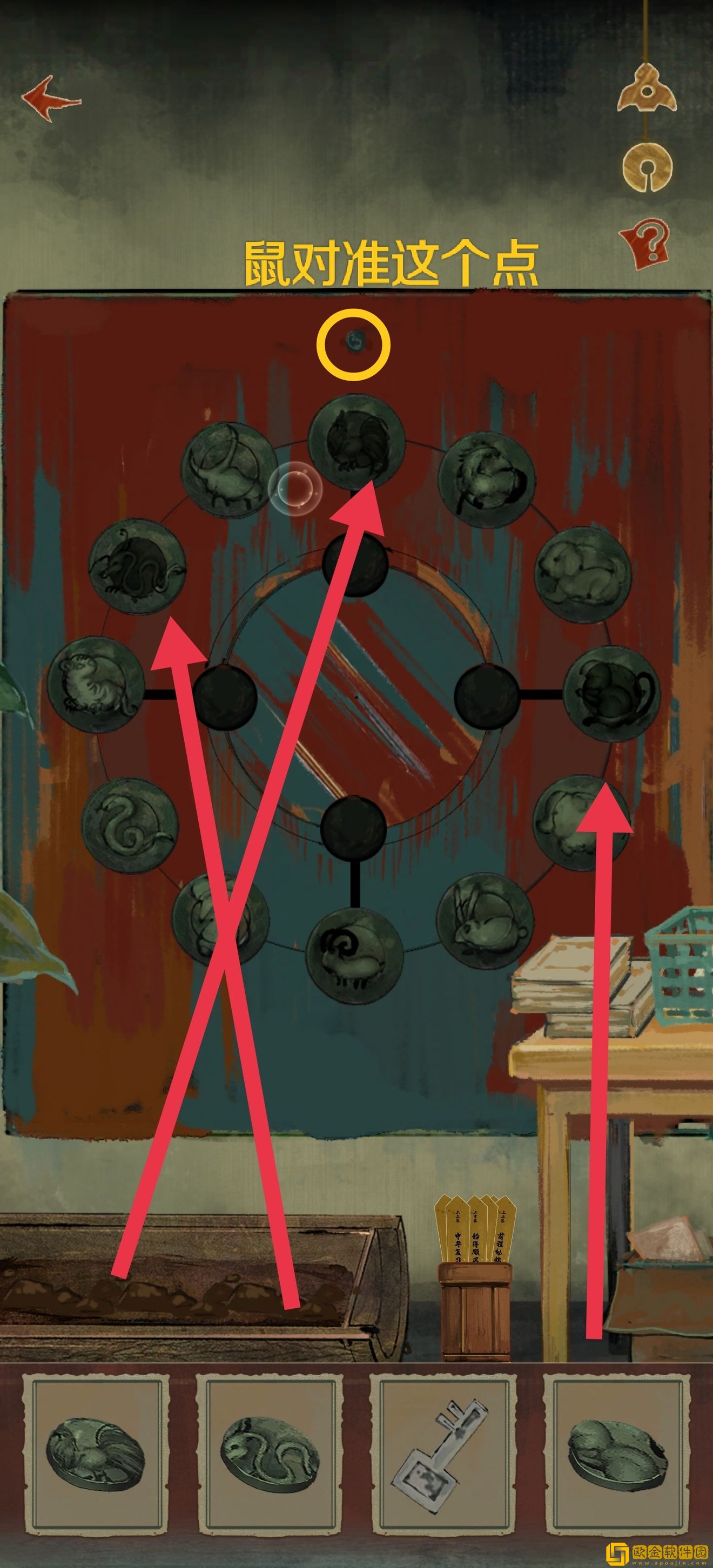 将符咒安装到对应的生肖上,旋转里外盘(不是转符咒,转符咒是转不动的)然后按照十二生肖的顺序排列,将鼠对准最上面的点(这里没截着完成图),就可以打开机关了