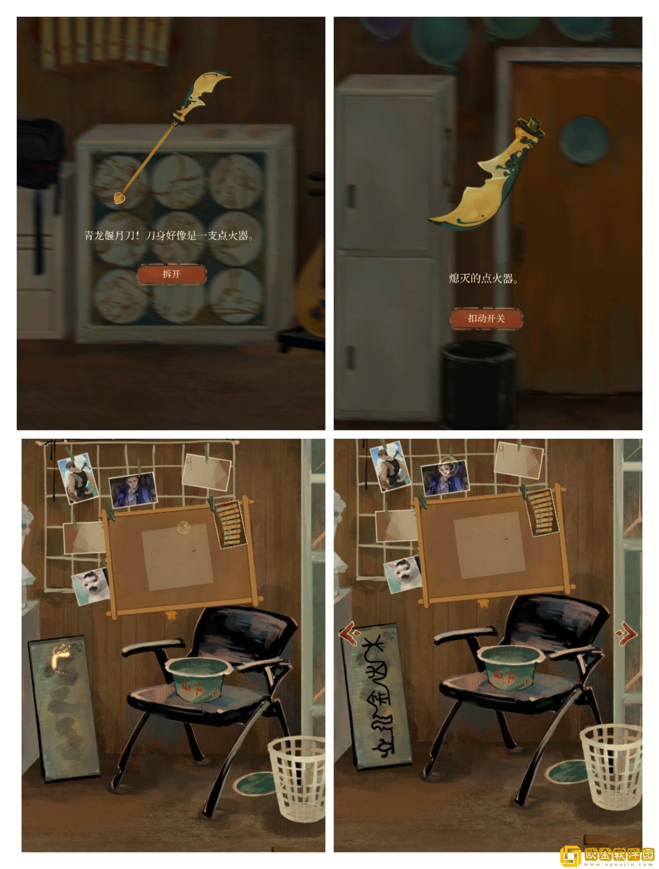 然后拆开青龙偃月刀获得锤子和点火器,点燃点火器,在左下角使用可以获得密码锁的密码