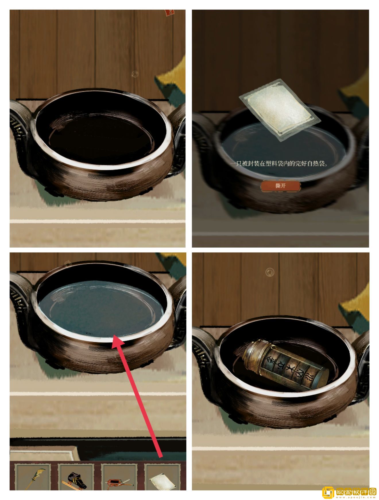 将水加入香炉,拆开自热袋放进香炉,可以获得一个密码锁