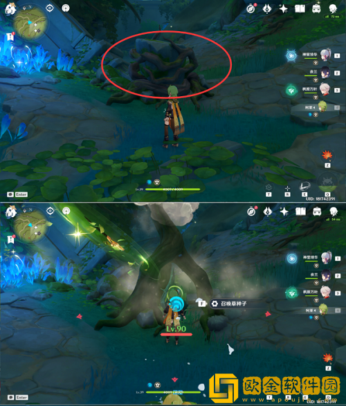 3.找到下图一中的被缠绕的东西,用草元素攻击后召唤草种子,向图三中有草元素标志的石块攻击(重击瞄准射击),然后会出现草元素方碑,用草系角色攻击或者弓箭角色携带草种子重击,点亮四个方碑后解锁机关。
