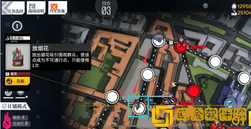 4、第三回合,玛姬向下走,走到最后时,在方框处使用烟花,阻挡敌人。