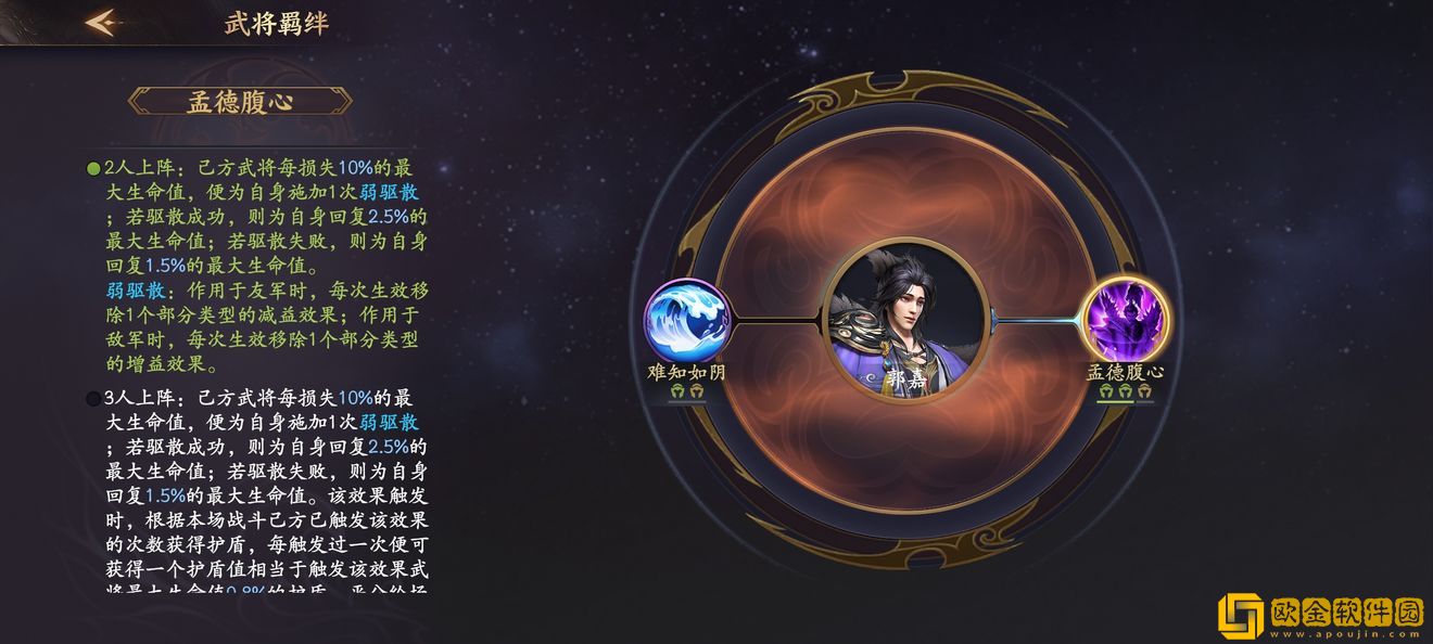 精通羁绊:与华佗/鲁肃/黄盖/步练师/张昭/太史慈/法正/荀攸/蔡文姬/卢植搭配,即可激活羁绊“难知如阴”