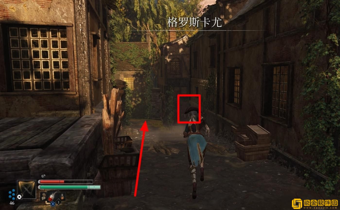 沿着小路深入居民区,右前方的凹室中有1个原型机埋伏。