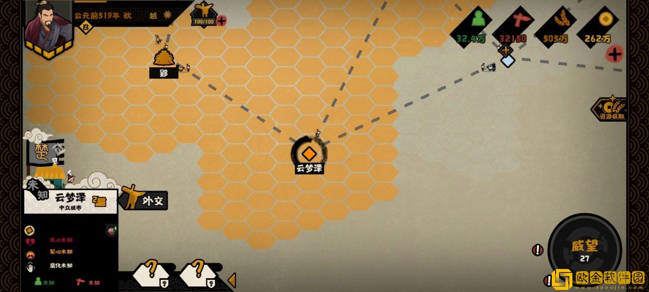 越国开局:打下来吴国一座城市,sl臣服楚国,这个时候我们越国4座城市,是吴国1.5倍,决战吴国。三战拿下他两座城市。