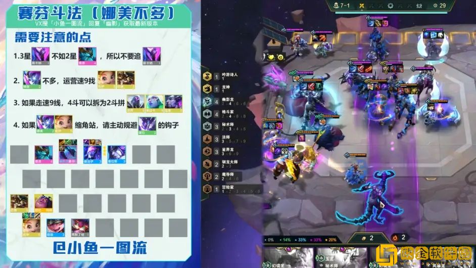2-3阶段:星界* 、斗士* 、驯龙* 全抓,娜美不来可以崔丝塔娜带装备打输出,肉装给斯卡纳带着,2-1升4,2-5升5,3-2升6,6级没质量就搜,然后看个人喜好,6级追7级追都可以,7级可以挂4斗,且赛芬概率高,实际没那么严格,缺质量就小搜下