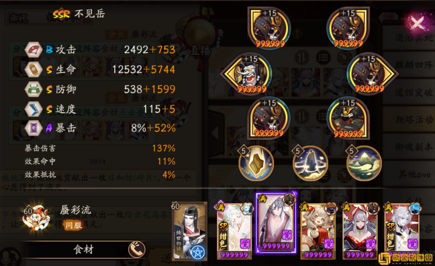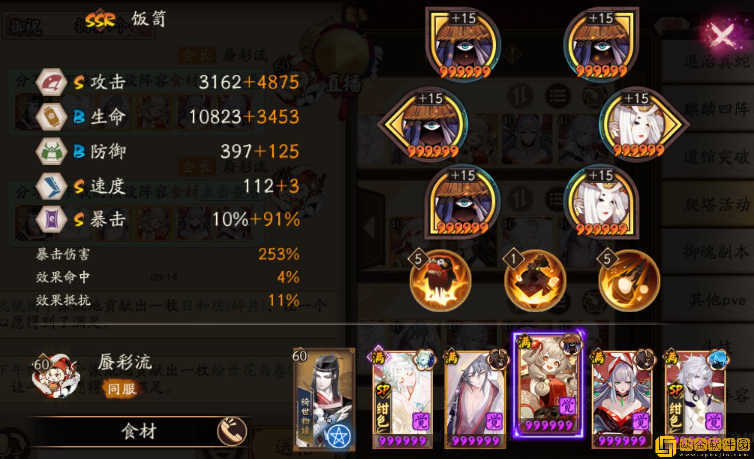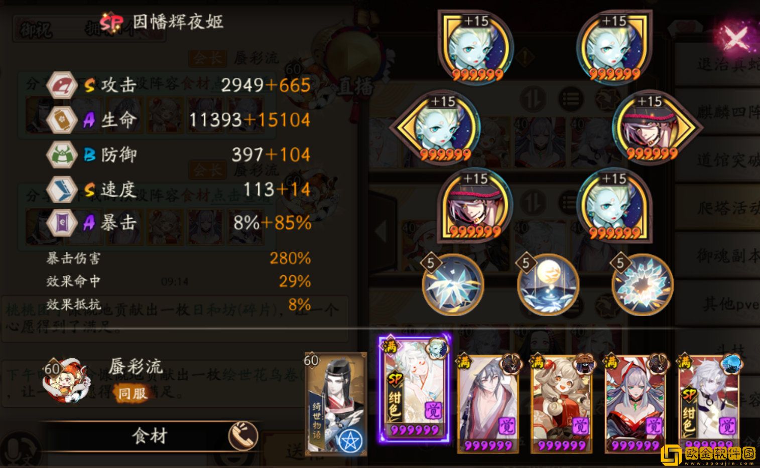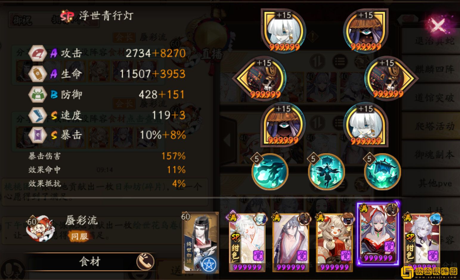 SP辉夜姬:蚌精/散件,攻攻爆(蚌精生生爆),满2技能——如果不带蚌精,9层P1青蛙有概率会导致减员