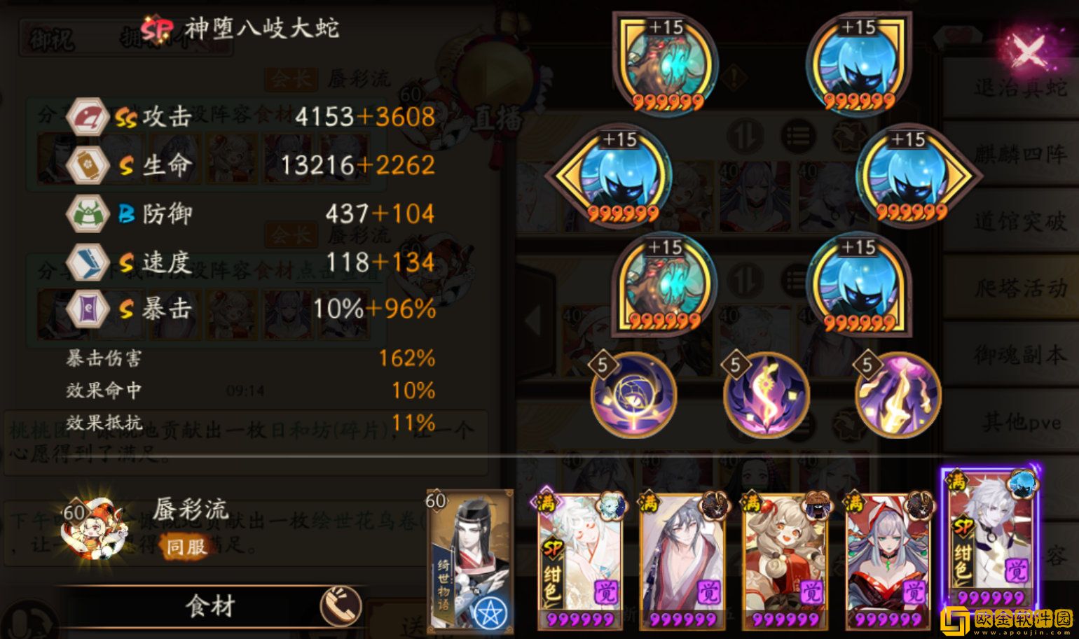 SP大蛇:速攻暴,破荒/破势,满2/3技能,速度大于>220