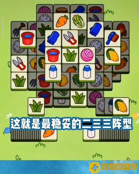 注意看这颗青草,它不仅是整张图的中心点。也是叠* 最少的一个位置。下面仅有四张* ,所以不到万不得已,我们先不要削它,然后找到这个青草周边的两组,可以翻箱的卡* 。我选的是两个木头和两个胡萝卜。不过要注意的是,我们先不要着急去消除。而是去找三个可以消除的其他卡* 。这就是最稳妥的二三三阵型。然后按照这样的思路一直消下去。