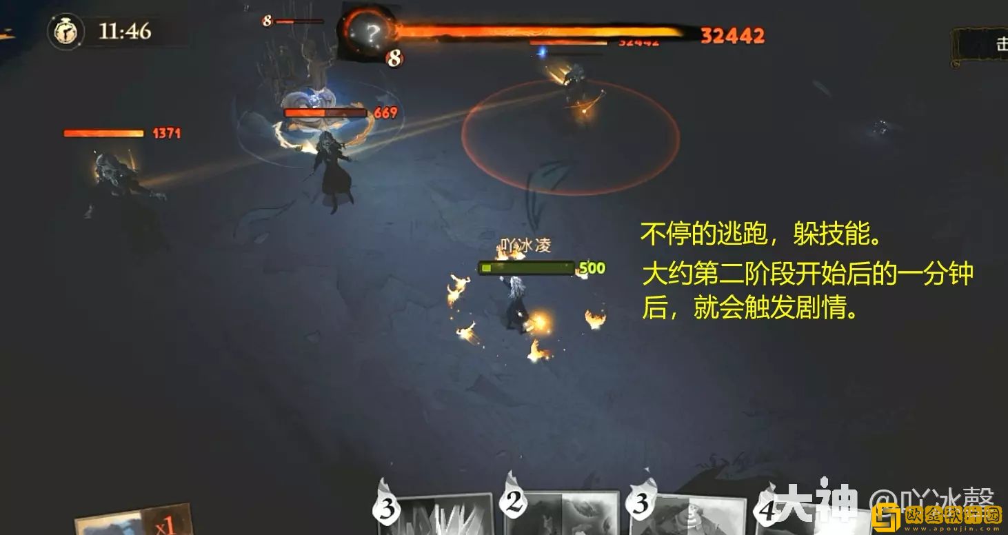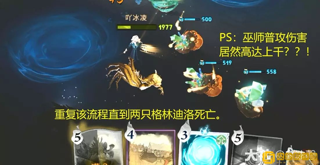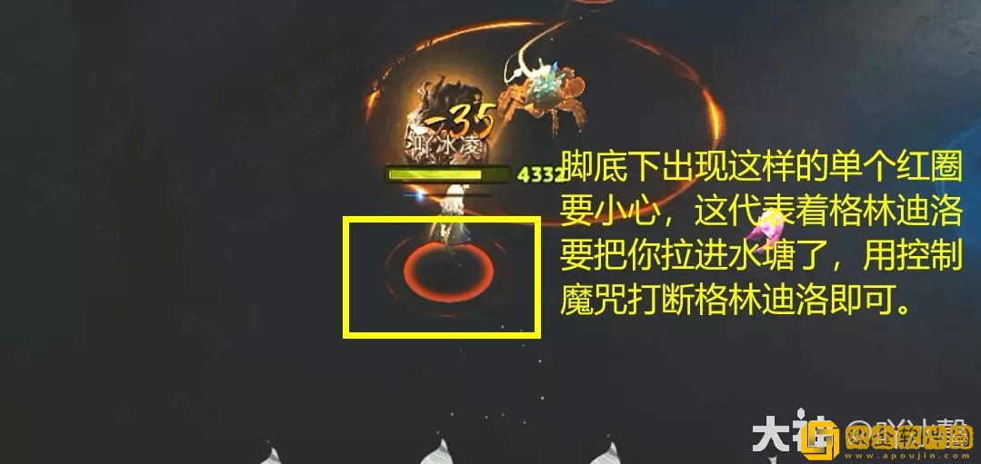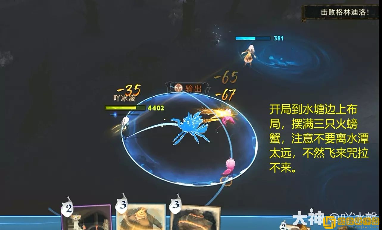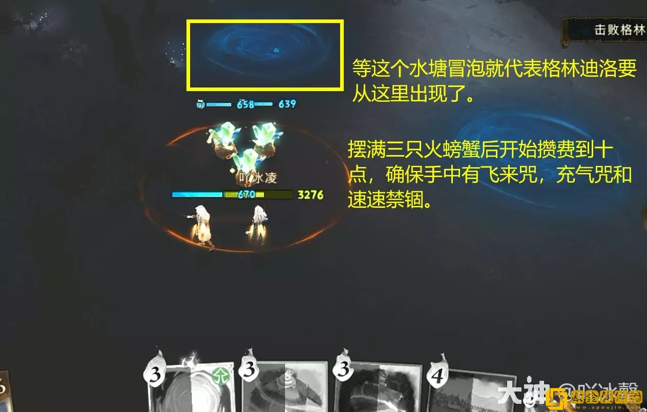 战斗开始会有两只格林迪洛从三个水潭中随机出现,同时场内会不停刷出恶婆鸟。格林迪洛在水内是无敌的,同时返回水内后血量会极快的回复。