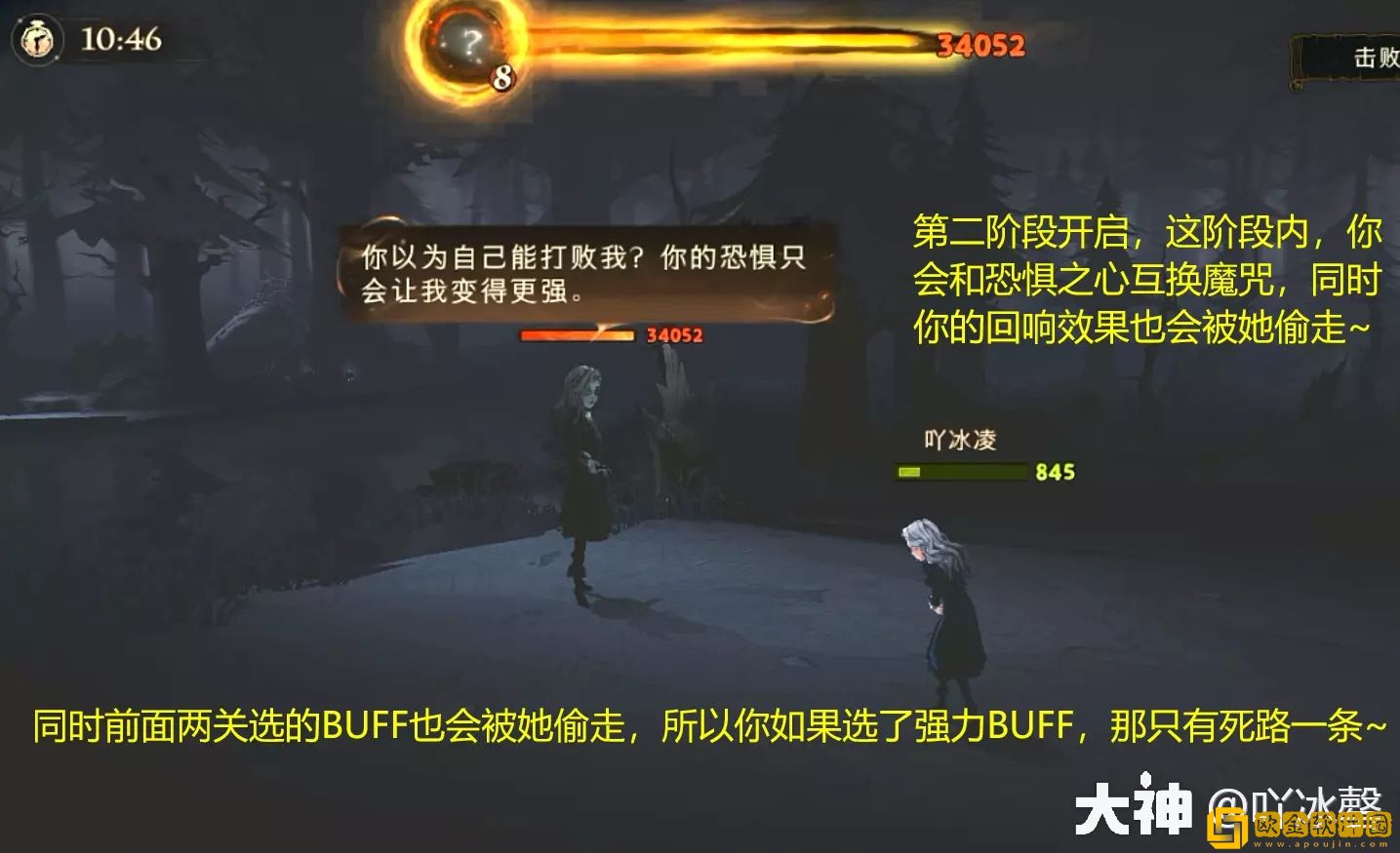战斗开始会有一只恐惧之心(当成会放魔咒的巫师BOSS即可)和三只摄魂怪。恐惧之心会幻影移形。