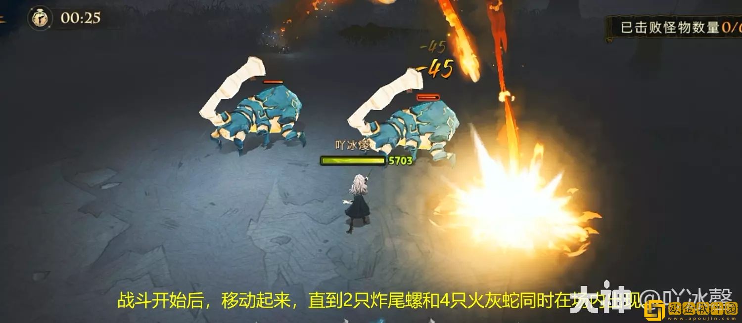 战斗开始前,炸尾螺便在场内了,随着战斗的进行会总共刷新出4只火灰蛇。