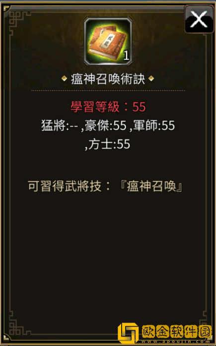 稀有掉落:兽鬼召唤术诀、战鬼之心术诀、瘟神召唤术诀、炼精化气术诀、旋樱秘笈、烈风秘笈、体魄强化法、刺伤强化法、全阵形精通书、气力增加之书
