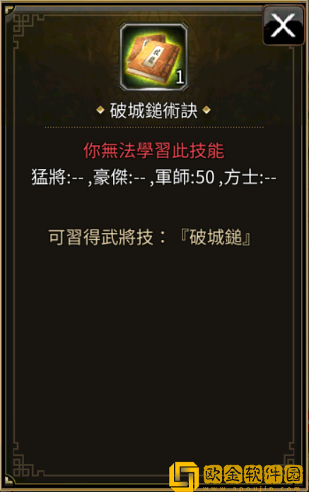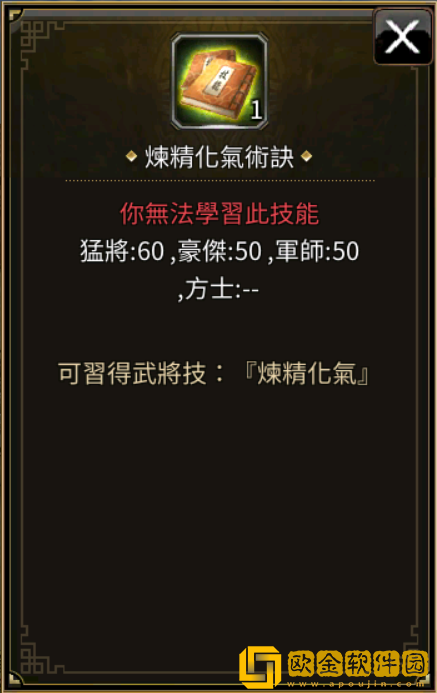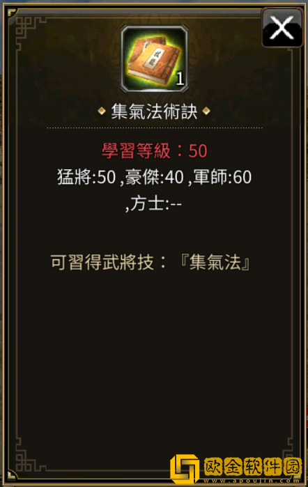 稀有掉落:气力增加之书、全阵形精通书、大喝秘笈、真劲发动术诀、八面火术诀、武力强化法、爆击强化法