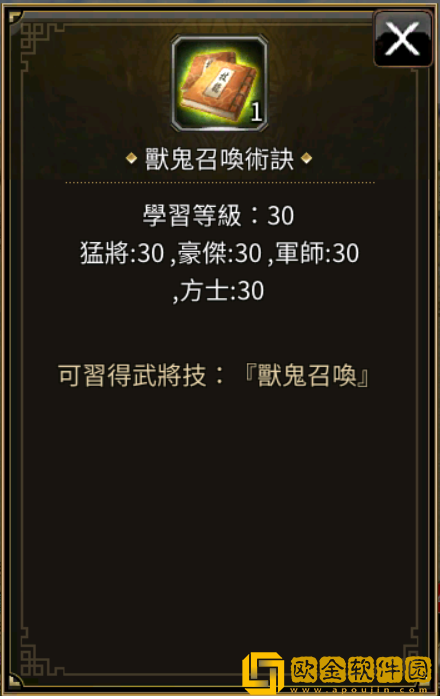 稀有掉落:兽鬼召唤术诀、集火柱术诀、瘟神召唤术诀、真劲发动术诀、八面火术诀、烈风秘笈、全阵形精通书、气力增加之书、智力强化法、碎伤强化法