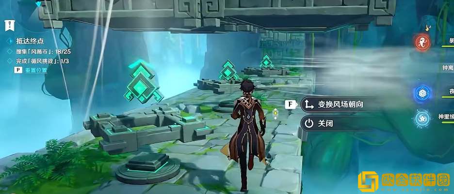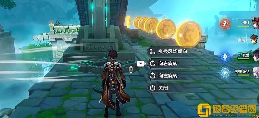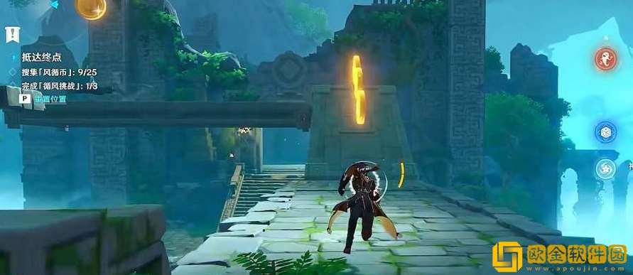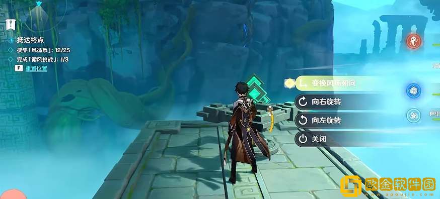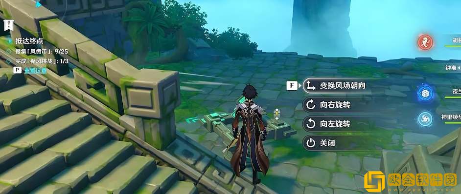 2、拿到3个风循币进入大厅,击败丘丘人。穿过大厅后往左转,利用机关改变风场方向,向右旋转两次前面的柱子就倒塌了,继续朝东方向前进;