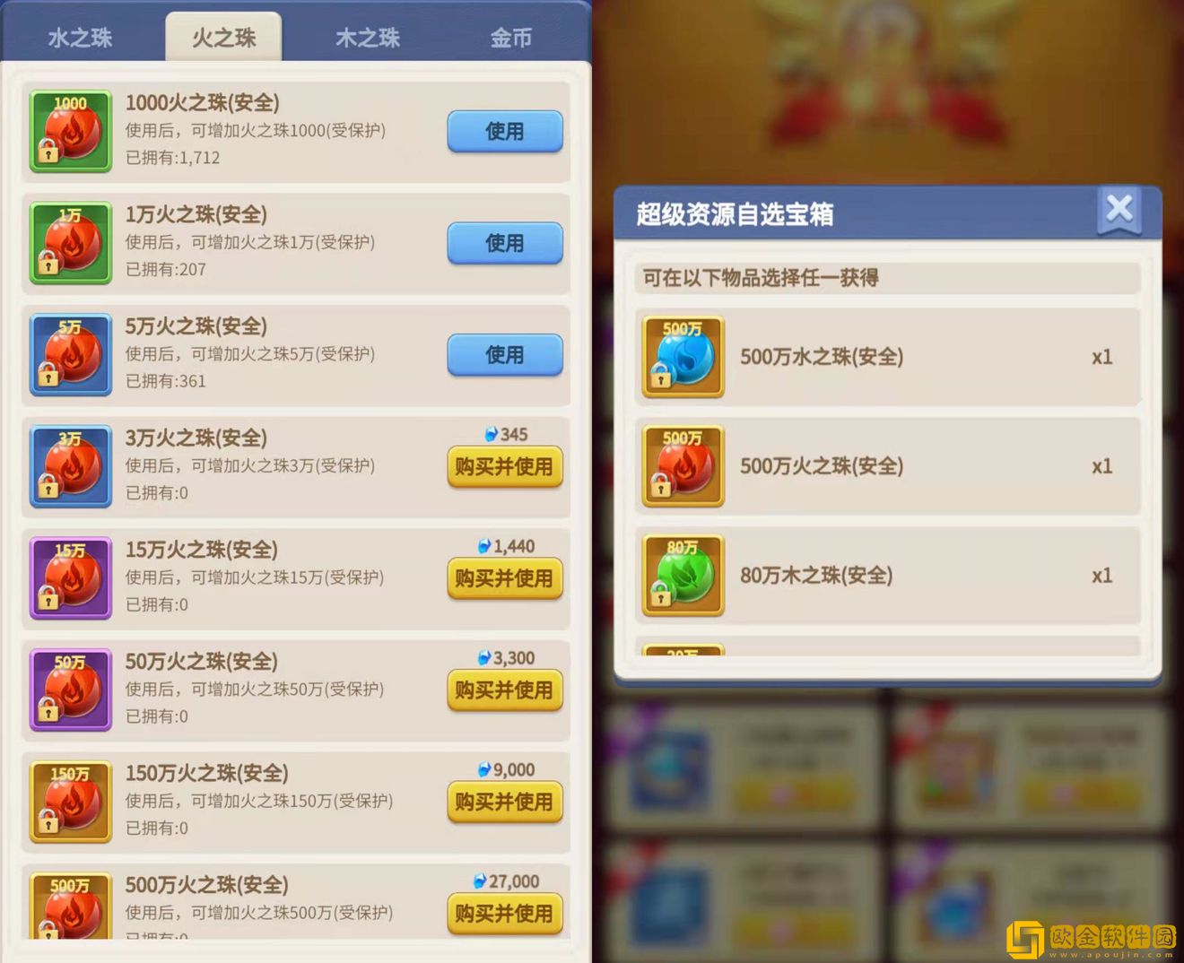 水之珠、火之珠、木之珠、金币四种基础资源,主要应用于建筑升级、科技研发、士兵训练三大领域,获取的途径也十分广泛:
