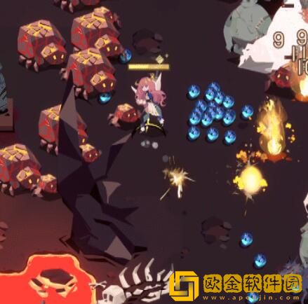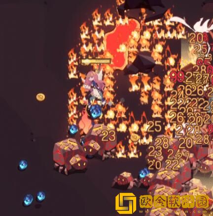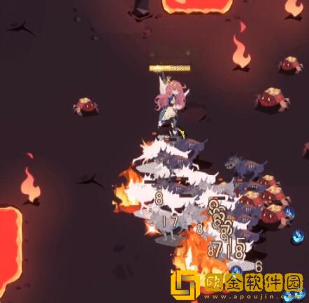 效果:向后方发射火花状投掷物,落地后会变为一团火焰,吸收击杀的敌人经验,经验按比例转换成金* 。