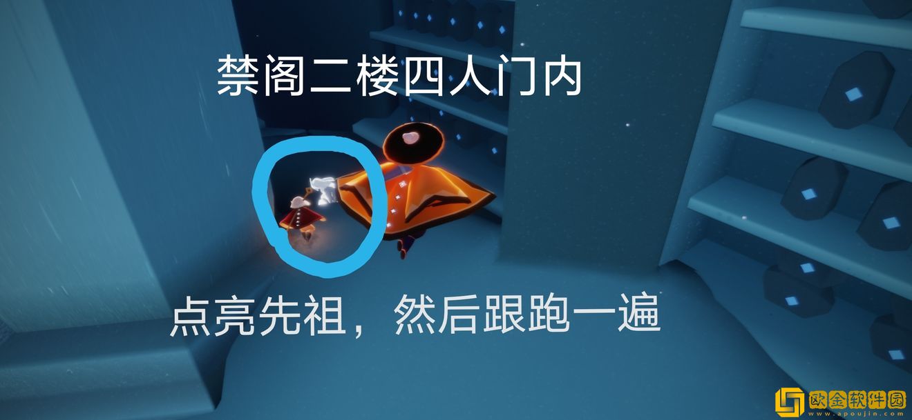 禁阁二层,四人门内左边柱子后,点燃先祖然后跟着跑一遍