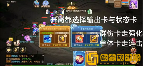 1、开局都选择输出卡与状态卡,群上卡走强化,单体卡走连击。