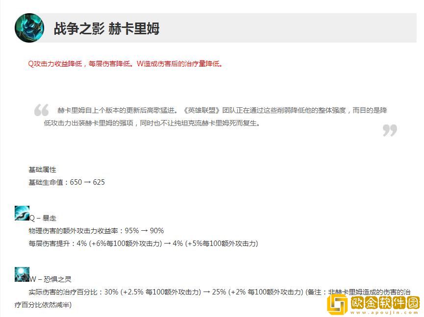 Q攻击力收益降低,每层伤害降低。W造成伤害后的治疗量降低。