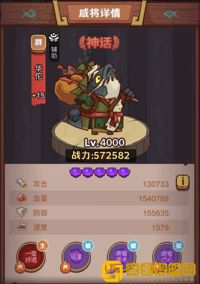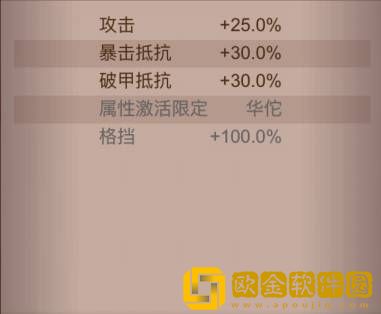 属性:攻击增加25%,暴击抵抗增加30%,破甲抵抗增加30%,安放在华佗身上之后激活限定属性,格挡增加100%,几乎直接可以无视对方伤害。