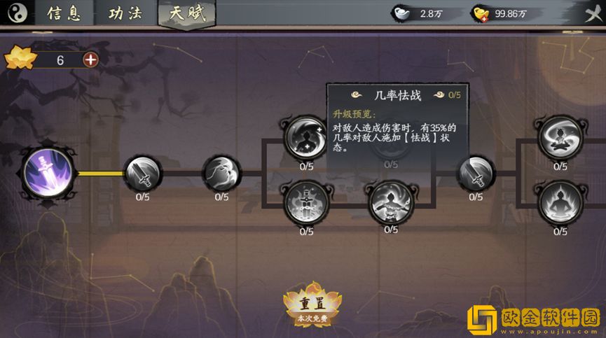 掌门可以根据侠客的天赋特点,在天赋树中点出战斗中的其他效果,或点出侠客自身天赋效果增强。