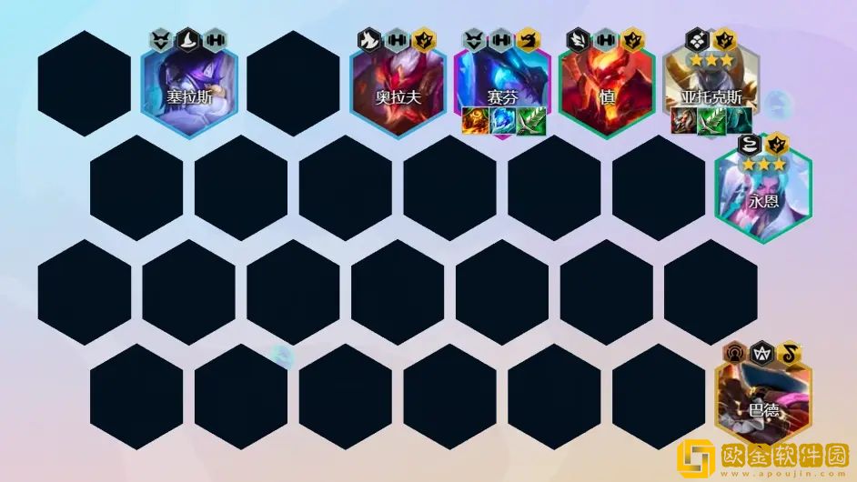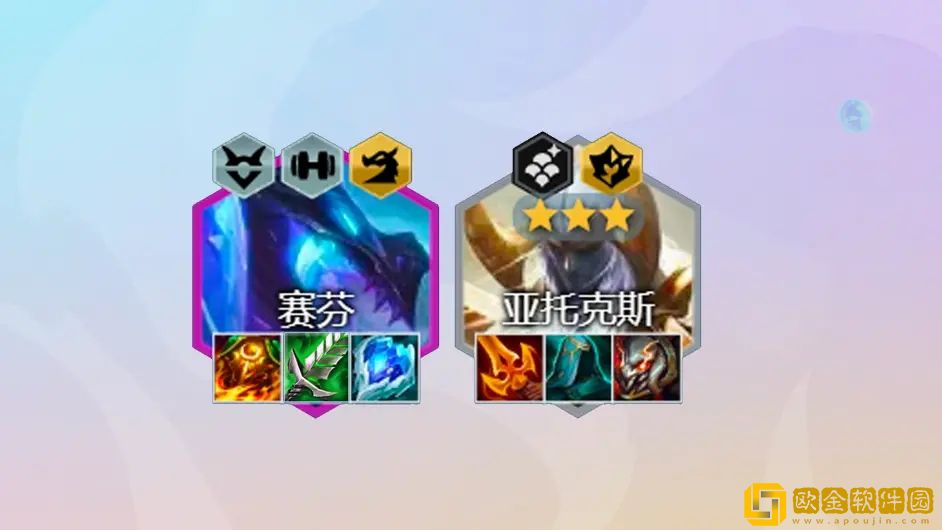 这是一套以亚托克斯为核心的D卡流阵容,前期利用3星亚托克斯在3、4阶段的强势期,过渡拉高人口,后期找到2星亚索和赛芬支持阵容强度。