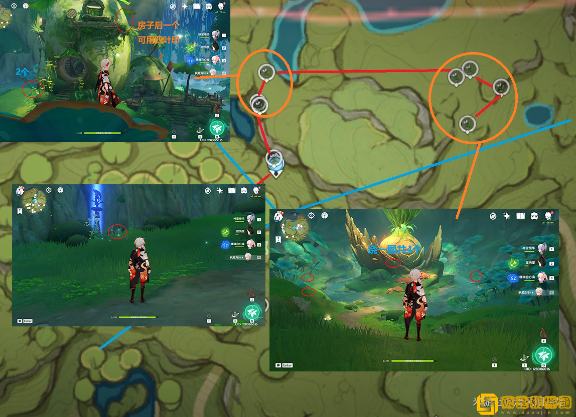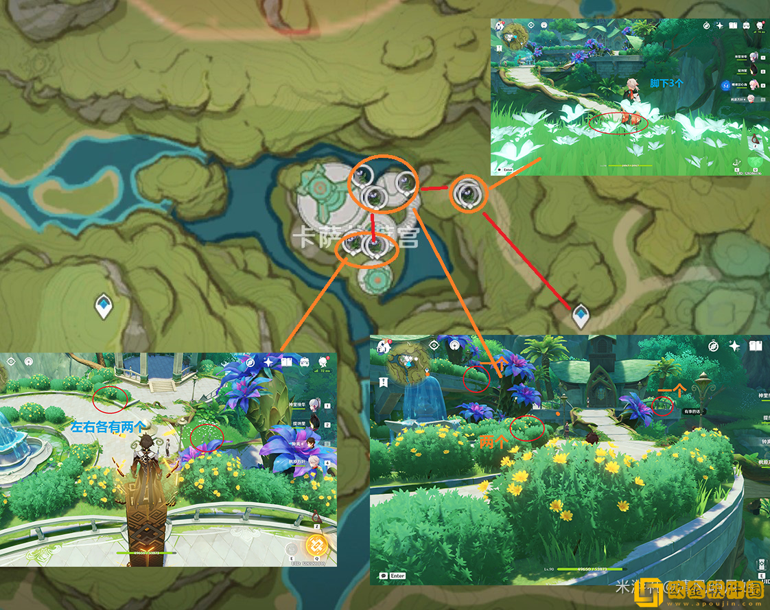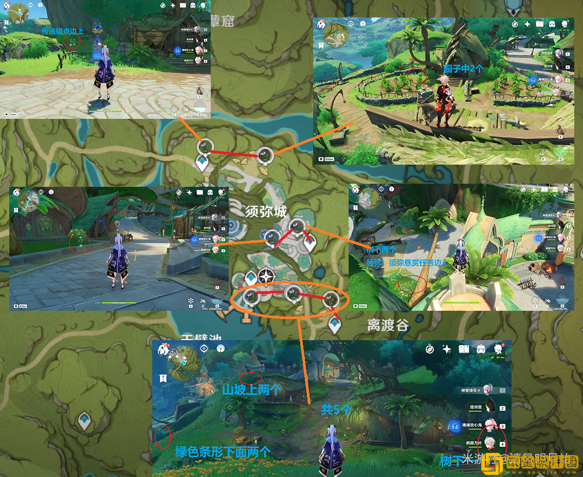 4.3须弥城边缘:分别在传送锚点右侧的一个树下石头旁边(1)、在一对老**老奶奶旁边的山坡上(2)、前面的带着绿色条幅的建筑物下面(2)