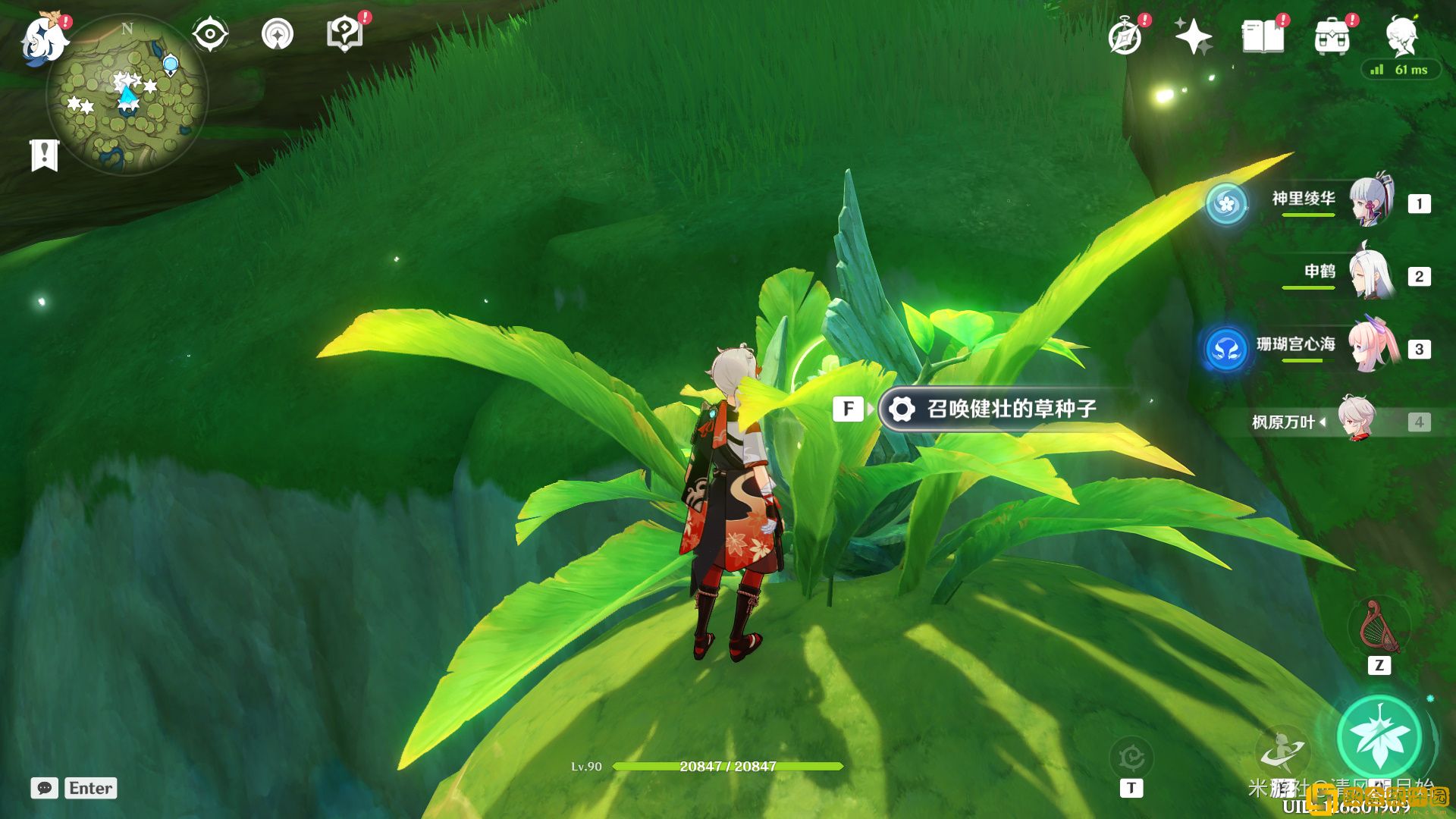 从小房子左侧上去石台阶,视角上移,有四叶印可以使用,使用四叶印达到第一个平台上,有一个,这时候,不要爬,我们来到合适的位置,同样视角上移,使用四叶印飞上去,在房子后面有三个可以采集,采集后,我们跳下去,有一个草种子,我们需要准备老旧的诗琴,演奏新芽迸发的曲调,召唤强健的草种子,重击面前的石头,在洞中找到三个,共七个。