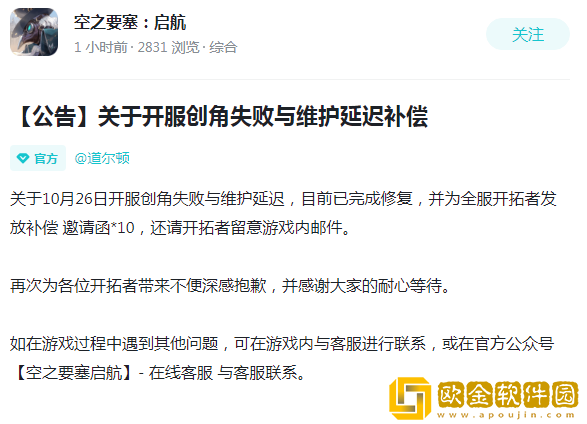 关于10月26日开服创角失败与维护延迟,目前已完成修复,并为全服开拓者发放补偿 邀请函*10,还请开拓者留意游戏内邮件。