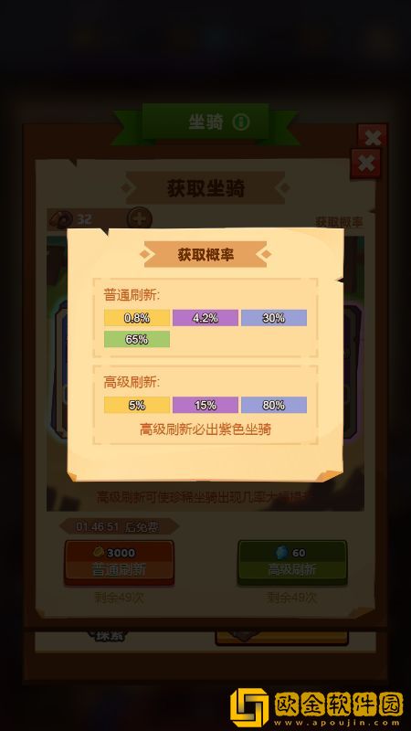 (2)主要的获取方式就是打开坐骑点击进入,就会看到最下面有“获取坐骑”的图标,点击进入就可以看到第一个选项是使用金币刷新,使用金币刷新出现珍稀坐骑的概率很低,第二个选项是使用砖石刷新,使用砖石刷新出现珍稀坐骑的概率会高出很多,但是小编不建议大家使用砖石刷新(土豪玩家当我没说),因为宝箱十二级之后的* 会溢出。所以用金币来刷新是最划算的。坐骑刷新出紫拿紫、出金直接拿。金色以下的只需要升到十级就够了,刷新概率如下图所示