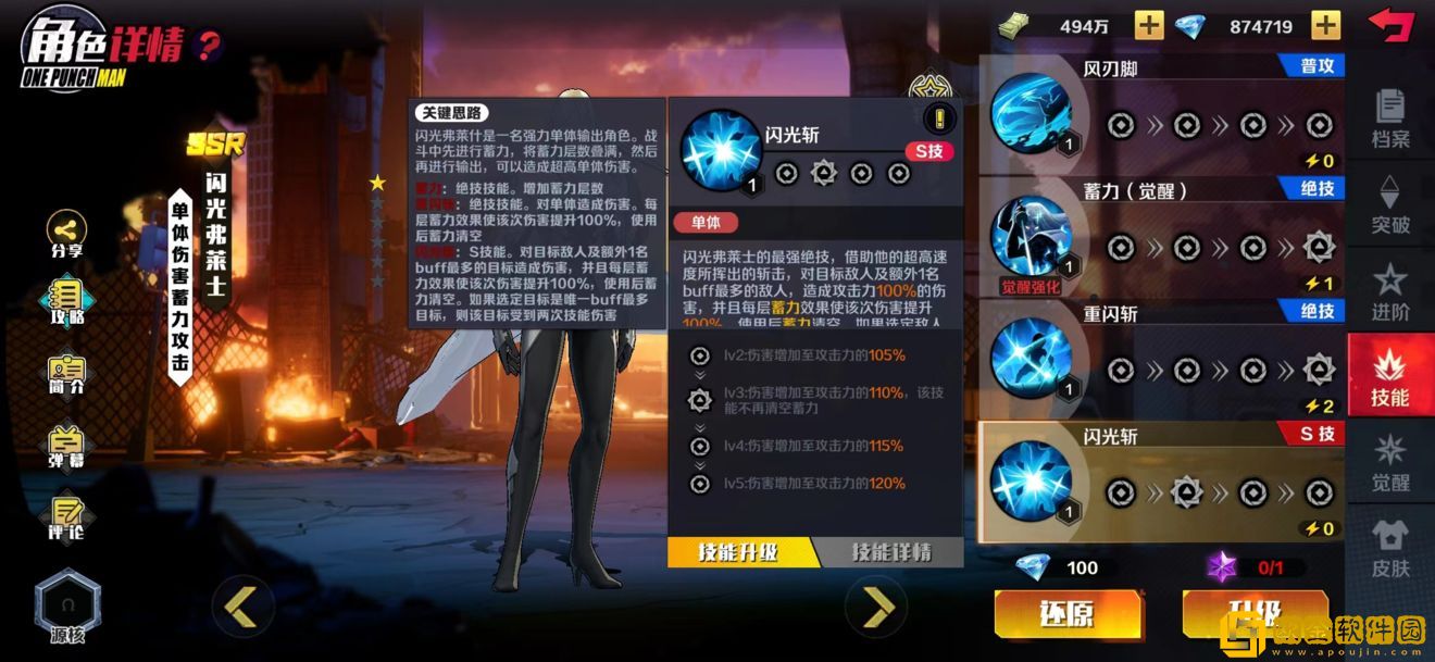 S技·闪光斩:对1名敌人和其他敌人中BUFF最多的1名敌人造成100~120%的伤害,每层蓄力会使此次伤害增加1倍,使用技能后清空蓄力。技能3级后,使用技能不清空蓄力。