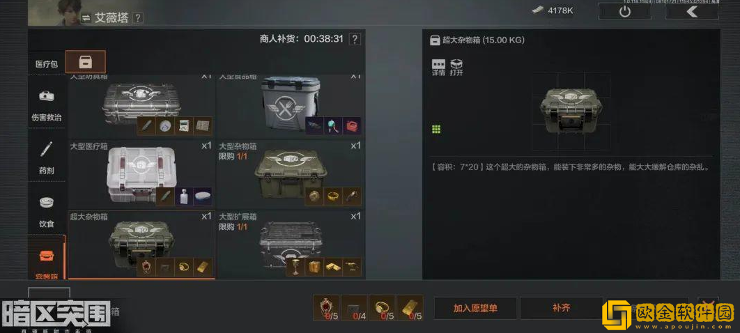 目前联络人艾薇塔正在出售各种类型、容量的容器箱,每种容器箱都需要一定数量的特定道具进行兑换,并且更大容量的容器箱需要达到一定等级(8、14、20级)才会解锁。
